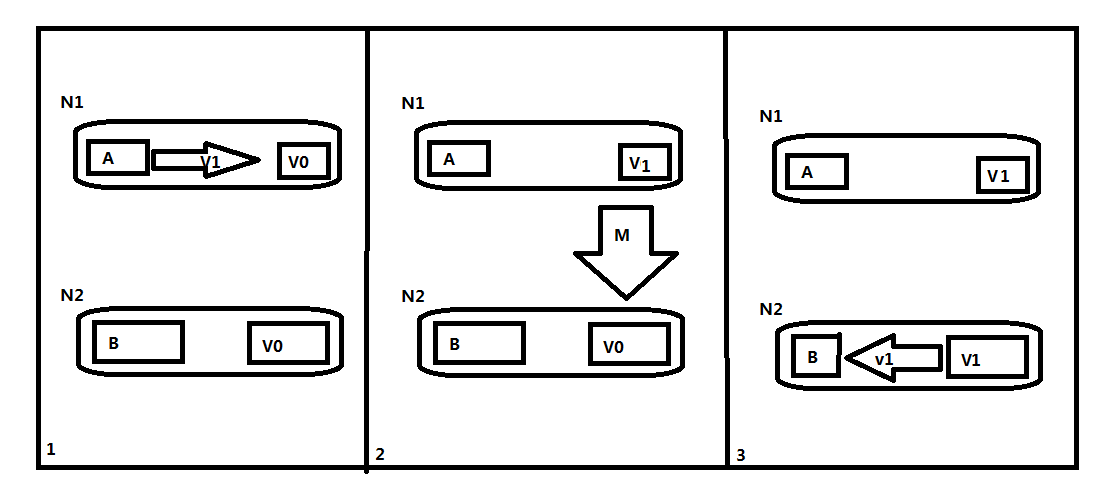- 然后消息(M) 从N1 更新V 的副本到N2.