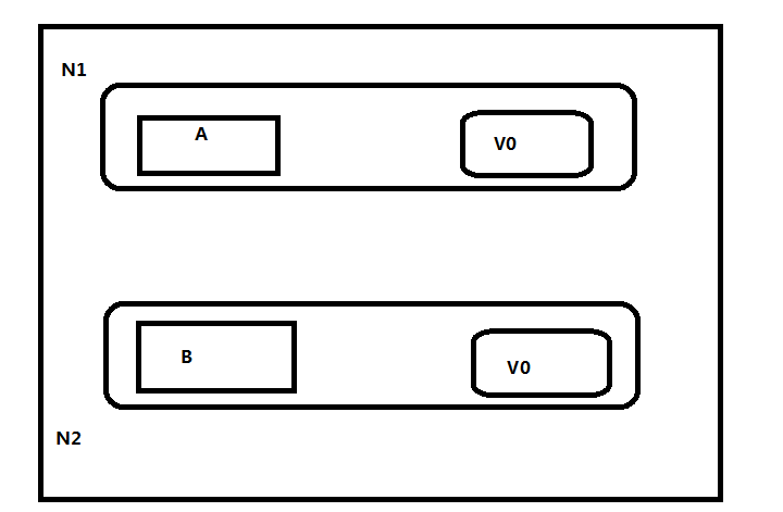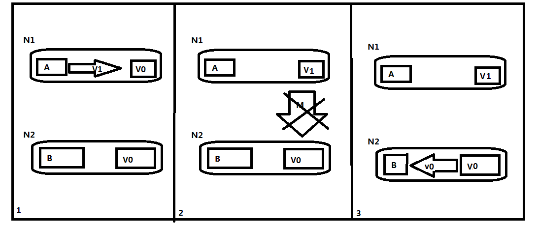 下图 显示了在一个网络中,N1,N2 是两个节点,他们共享数据块V 其中一个 值V0, 运行在N1 的A 程序可以认为是安全的,无Bug,可预测的和可靠的,运行在N2 的是B 程序,在这个例子中,A 将写入V的新值。而B从V 中读取值。