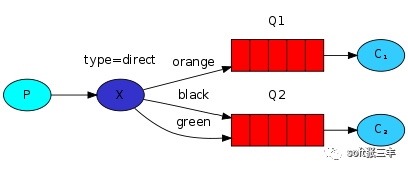 在该图中,直连交换器X上绑定了两个队列。第一个队列绑定了绑定键orange,第二个队列有两个绑定键:black和green。在这种场景下,一个消息在布时指定了路由键为orange将会只被路由到队列Q1,路由键为black和green的消息都将被路由到队列Q2。其他的消息都将被丢失。