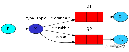 在这个例子中,我们将发送所有跟动物有关的消息,这些消息将会发送到由三个单词,两个点号组成的routing key,第一个单词了表示的是速度,第二个单词表示颜色,第三个单词表示种类: