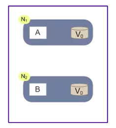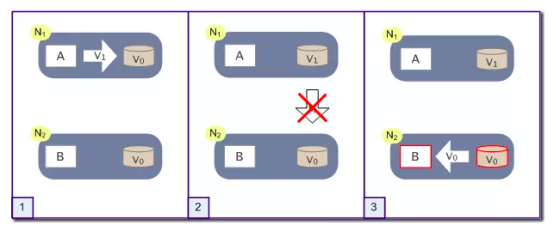 如图,在一个网络中,N1和N2即分布式系统中的两个节点,他们都共享数据块V,其中有一个值是为V0。