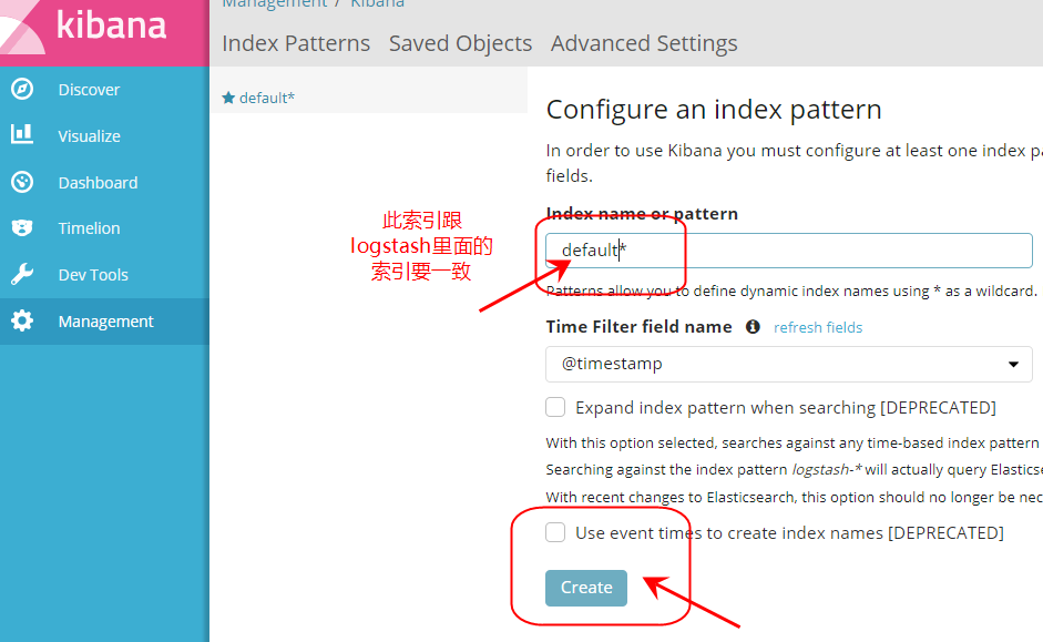 打开kibana,添加一下索引,当然这个索引名称需要和上面在logstash中的es索引一样,因为是要根据索引名称来查找数据的。