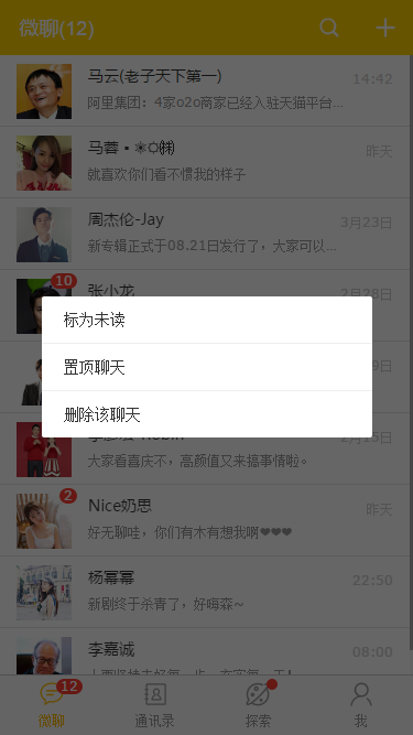 之前做过一版h5微信聊天移动端,这段时间闲来无事就整理了下之前项目,又重新在原先的那版基础上升级了下,如是就有了现在的h5仿微信聊天高仿版,新增了微聊、通讯录、探索、我四个模块 左右触摸滑屏切换,聊天页面优化了多图预览、视频播放,长按菜单UI,聊天底部编辑器重新优化整理(新增多表情),弹窗则用到了自己开发的wcPop.js,具体看项目效果图吧!