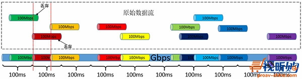 由于Best Effort的机制,通常具有一定带宽的一个数据流会在每秒中不同时间段传输,尽管所占用的带宽相等,但在每个时间段上的时间节点却不同。如图七所示,这样在多个数据流共存的时候,就会很容易产生带宽重叠的现象,从而导致丢包。