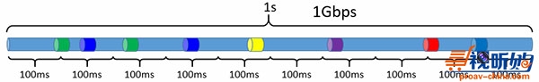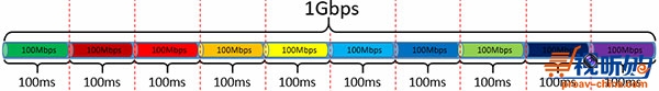 想通了这个问题,我们假设如果这10个100M的数据流能够头尾相连,严格按时间顺序排列如图五所示,那么答案是:“可以”。也就是说在理想情况下,这10个100M的数据流可以在1Gbps的带宽下顺利传到对端。