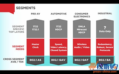 第一个应用就是我们的专业音视频(Pro AV)。在这个应用领域里强调的是主时钟频率。也就是说,所有的音视频网络节点都必须遵循时间同步机制。
