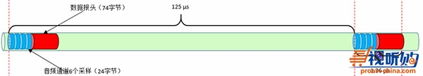 我们发现实时音视频流恰好是沿等长的时间间隔发布数据的。比如说:一个24比特48K采样的专业音频通道,每个采样的时间间隔是20.83 µs。如果我们按照每6个采样封装成一个数据包,那么每个数据包的固定间隔就是125 µs。每个数据包是由两个部分组成,数据报头(74字节)+音频通道采样数据(24字节X通道数)。