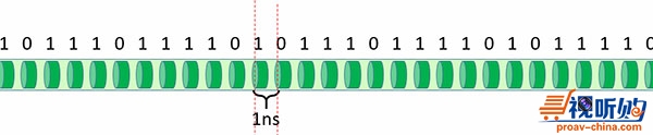以千兆网(1Gbit/s)为例:假如说交换机的端口带宽是1Gbps,则说明每秒可传输1000,000,000个二进制的“位”。大家一定要注意以太网中所有的传输都是串行传输,就是说在网卡的物理端口会在每一个单位时间内“写入”或是“读取”一个电位值(0或1)。那么这个单位时间对于1Gbps带宽来说就是1÷1000,000,000=1ns。如图一所示: