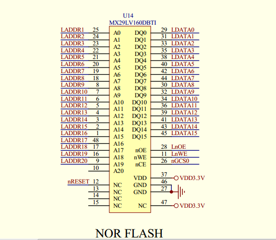 | RY/BY# | RY/BY#输出引脚 | 用于输出Ready和Busy信号,实际用时可以不接,可以用命令查询NOR Flash状态代替 |