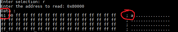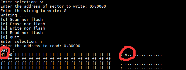 ②、未进行擦除扇区向0x80000地址写入G字符,接着读取这个地址里的数据,实际读取内容为0x41,不是0x47,结果符合上面描述。