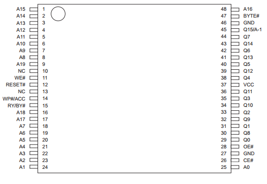 MX29LV60DBTI是16M-BIT的NOR Flash芯片,它的引脚如下图所示: