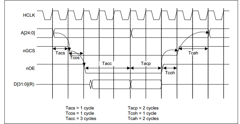 内存控制器的时钟信号由HCLK时钟信号提供,假设设置的HCLK的值为100M,1clock = 10ns。根据前面分析,Tacs、Tcos寄存器位设置为0,Tacc寄存器的为设置为101 = 8clocks。