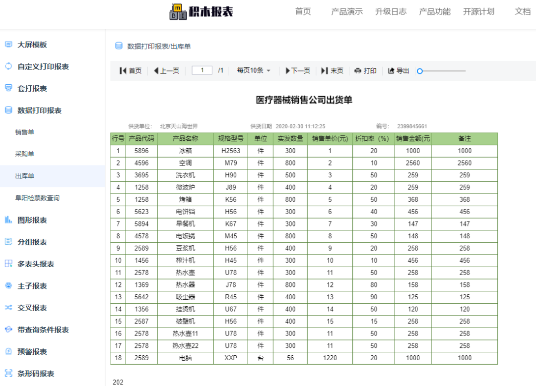 可设计各种类型的单据、大屏,如出入库单、销售单、财务报表、合同、监控大屏、旅游数据大屏等