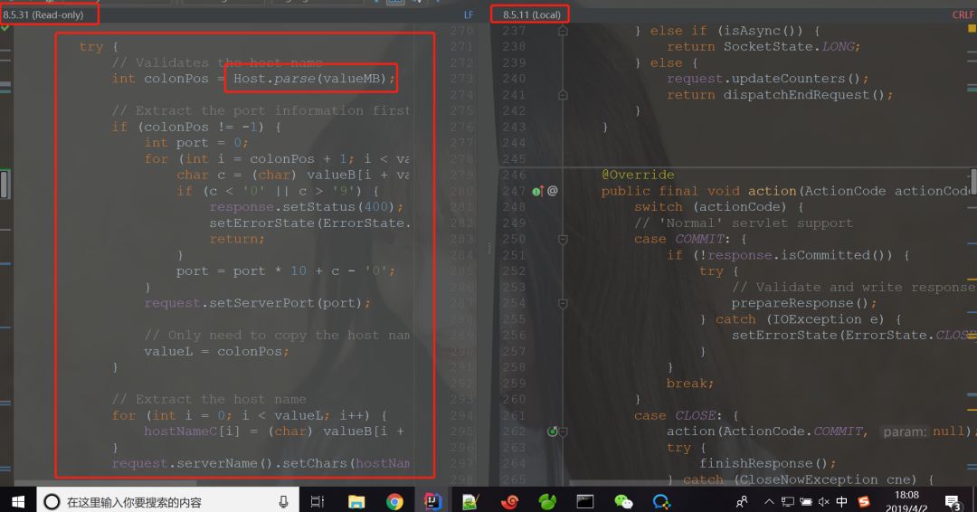 然后我在本次check了下tomcat8.5.31 和8.5.11的代码,比对了一下HttpParser以及AbstractProcessor类。对比结果如下: