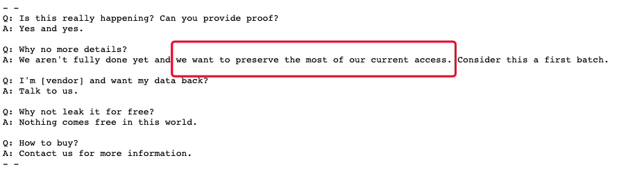 他们还表示未来将分批出售被盗的数据并发布更多信息,没有全部透露是因为目前他们还需要保留大部分访问权限。