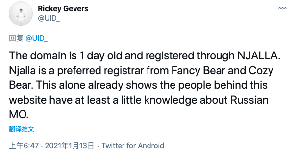 有研究人员发现"SolarLeaks"网站才刚注册,使用的域名注册商是 NJALLA。NJALLA 曾被俄罗斯黑客组织 Fancy Bear 和 Cozy Bear 使用过。