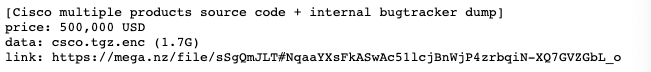 此外,黑客还声称要以 50 万美元出售思科的多种产品源代码,甚至包括思科内部的错误分析工具。