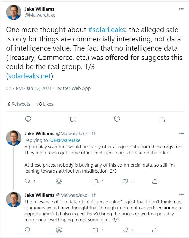 1 月 12 日,一个名叫 SolarLeaks 网站启动了,该网站表示正在出售微软、思科、FireEye 和 SolarWinds 的源代码以及相关数据。这几家公司的产品源代码均被标上了不同的价格,从 5 万到 60 万不等,全部打包售卖的价格为 100 万美元,并且不支持议价。