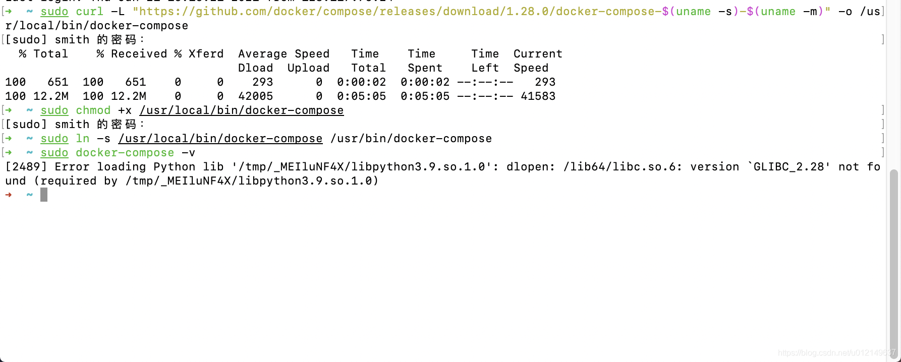 在安装完成docker-compose 1.28.0的时候,执行docker-compose -v可能会报缺少glibc2.28,不需要安装python3,这不是python3的问题.