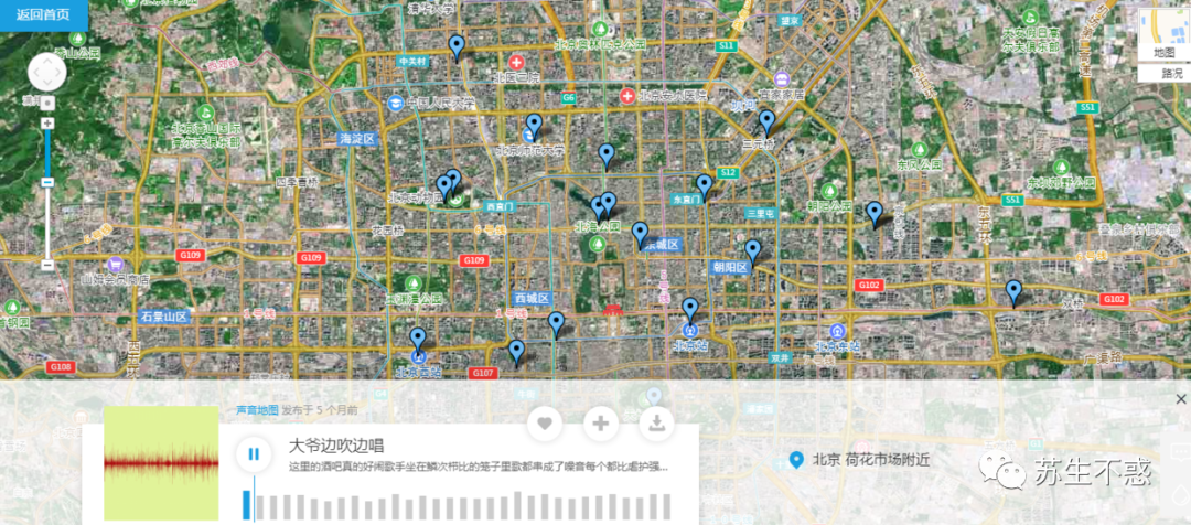 在地图上选择北京 北海公园 听大爷边吹边唱,你可以选择自己感兴趣的某个地方声音。 音频可以用idm直接下载到本地