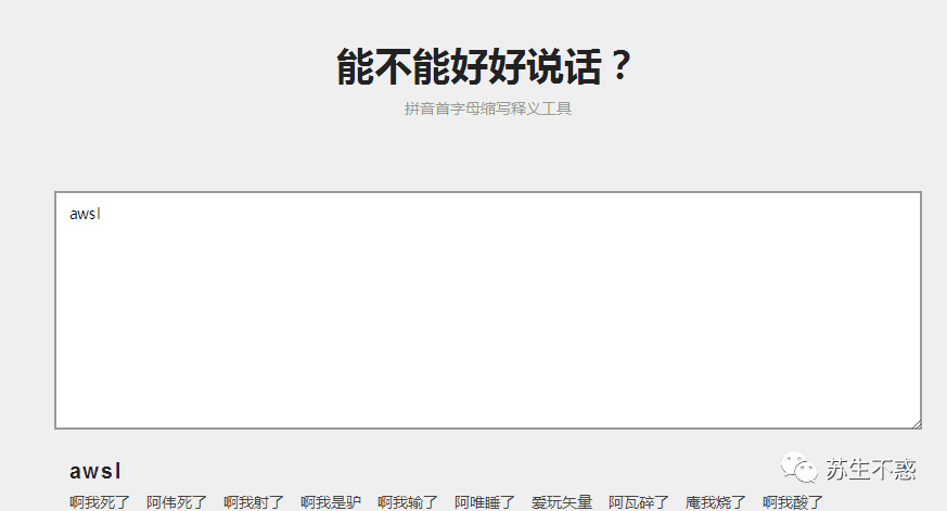 社交平台上通过拼音首字母缩写指代特定词句的情况越来越多,为了让更多人能勉强理解这一门另类沟通方式、有人做了这个划词转义工具 https://lab.magiconch.com/nbnhhsh/ ,  awsl 都什么玩意儿,能不能好好说话 !