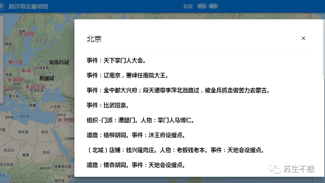 类似的网站还有金庸地图,地图上展示金庸小说人物所到过地点发生的事件。https://www.ageeye.cn/map/12518/?static=0#3/0/0/88.7695/41.5901
