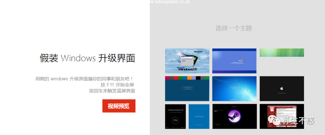 模拟各种系统升级的画面,上班摸鱼的时候boss快过来了赶紧升级下 http://fakeupdate.net/