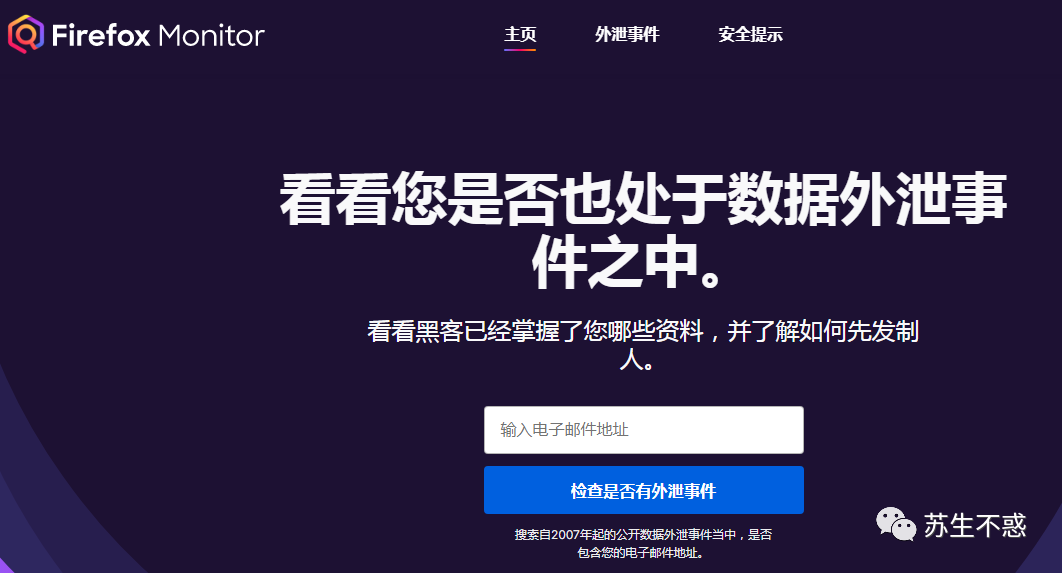 之前介绍过火狐的临时存储文件服务https://send.firefox.com/ ,这个也是火狐出品 https://monitor.firefox.com/