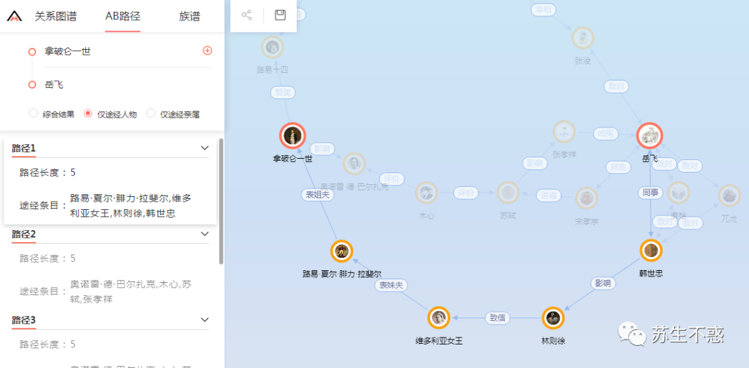 比较有意思的是 AB 路径 功能,可以把任意两个人物或事物联系起来 ,比如输入拿破仑和岳飞,通过4个人就能联系起来,并给你生成一张关系图谱。