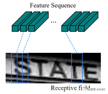 由于卷积层,最大池化层和激活函数在局部区域上执行,因此它们是平移不变的。因此,特征图的每列(即一个特征向量)对应于原始图像的一个矩形区域(称为感受野),并且这些矩形区域与特征图上从左到右的相应列具有相同的顺序。特征序列中的每个向量关联一个感受野。如下图所示: