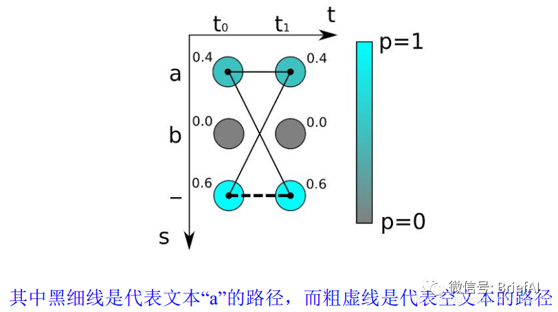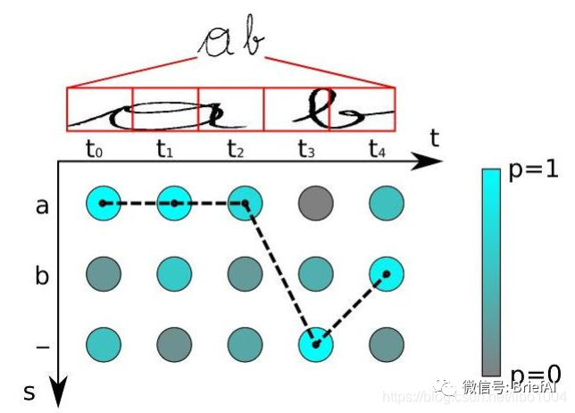相同的文本标签可以有多个不同的字符对齐组合,例如,“aa-b” 和 “aabb” 以及 “-abb” 都代表相同的文本 (“ab”),但是与图像的对齐方式不同。更总结地说,一个文本标签存在一条或多条的路径。