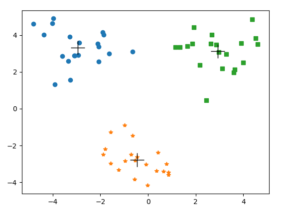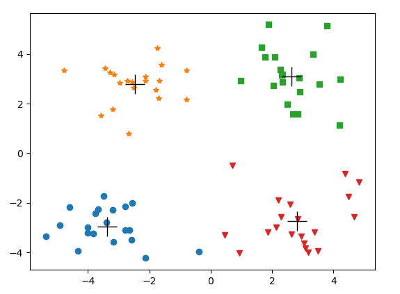 centroids[cent,:] = mean(ptsInClust, axis = 0) #将新的簇的均值作为新的质点