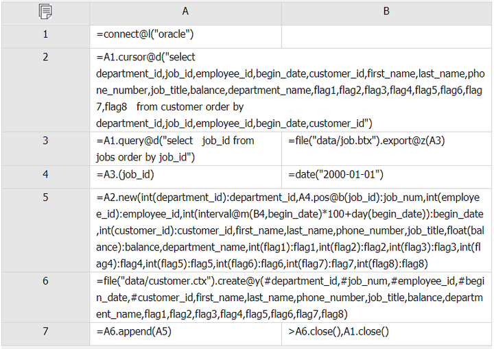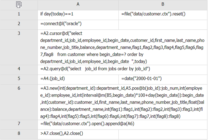 我们可以从数据库中读取新数据并按照部门等字段排序,再用 T.append@a() 函数追加,集算器会自动新建一个补文件,每天新数据都有序归并到补文件中,补文件相对较小,有序归并耗时较短。每月只需对客户表文件和补文件重整一次,将补文件有序归并到组表文件中。