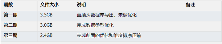 从上表可以看出,完成数据类型优化之后,文件大小减少了14%(0.5GB)。再完成维度排序压缩后,又减少了 20%(0.6GB), 总体减少 31%(1.1GB)。文件变小,能减少磁盘读取数据量,有效提高性能。