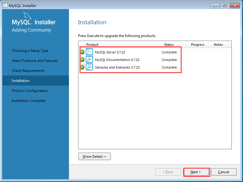 6. 开始安装MySQL文件,安装完成后在【Status】(状态)列表下降显示Complete(安装完成)。