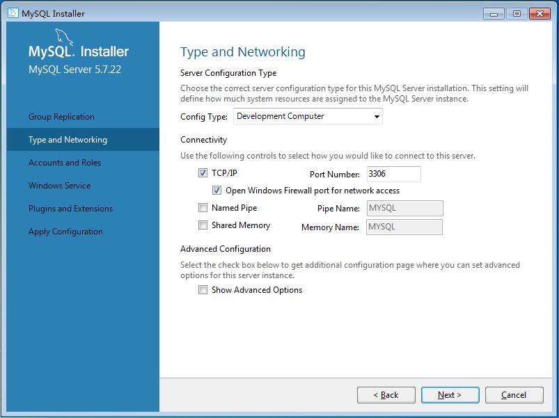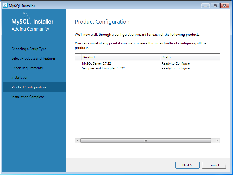 ,即可选择安装MySQL服务器。采用同样的方法,添加【Samples and Examples 5.7.22-X64】和【MySQL Documentation 5.7.22-X64】选项。