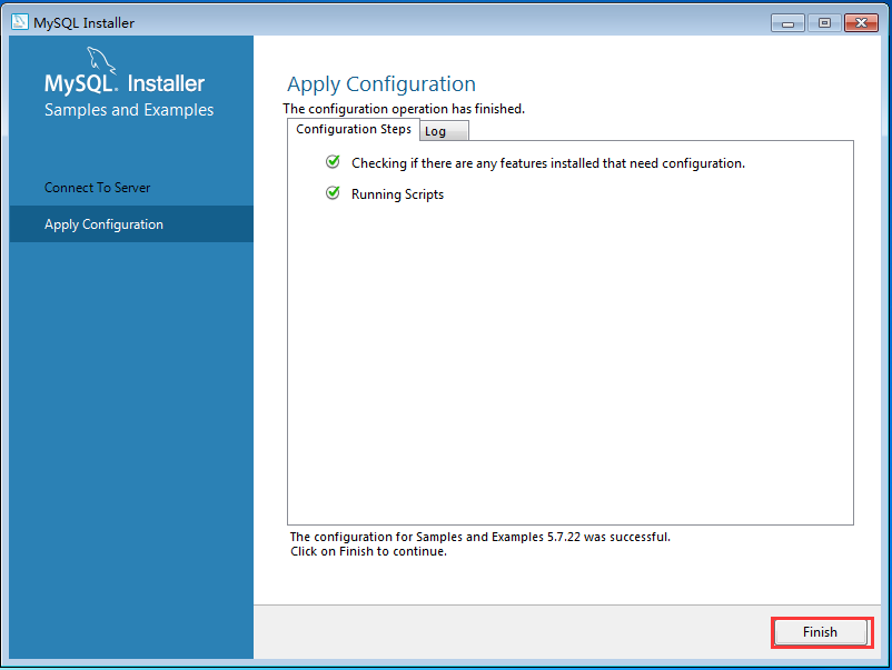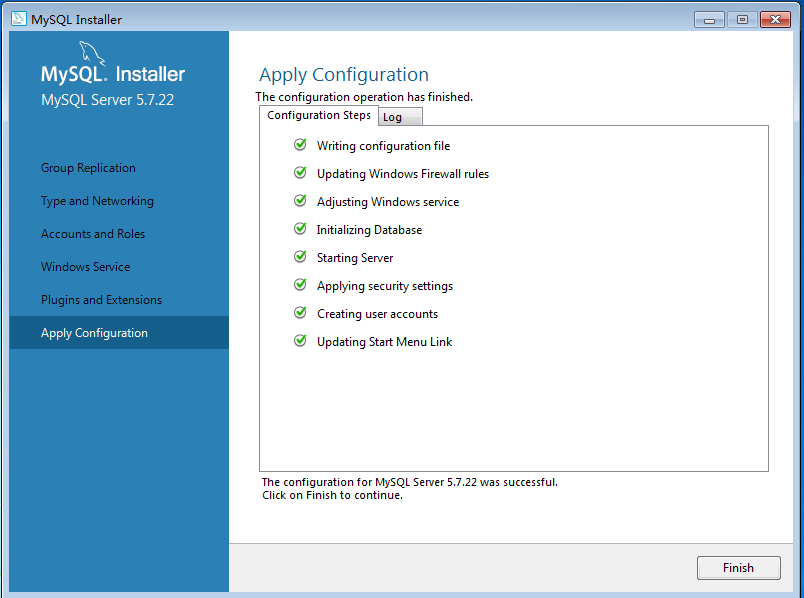 9. 配置确认完成后,单击【Finish】(完成)按钮。MySQL服务器即安装完成。