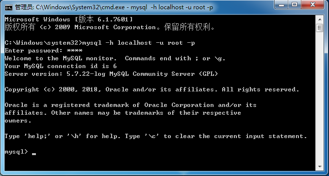 其中mysql为登录命令,-h后面的参数是服务器的主机地址,在这里客户端和服务器在同一台机器上,所以输入localhost或者IP地址127.0.0.1,-u后面跟登录数据库的用户名称,在这里为root,-p后面是用户登录密码。