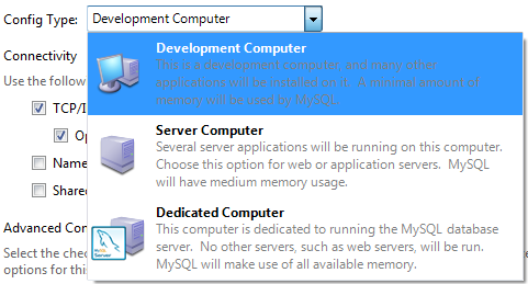 Server Machine(服务器):该选项代表服务器,MySQL服务器可以同其他应用程序一起运行,例如FTP、Email和Web服务器。MySQL服务器配置成使用适当比例的系统资源。