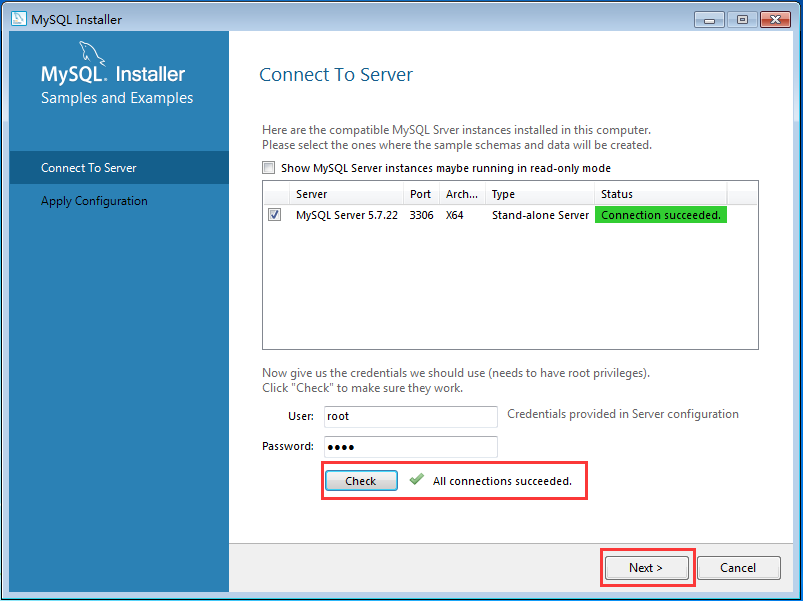7. 输入第三部设置的root密码,单击【check】(检查)按钮,测试服务器连接。