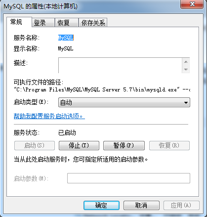 也可以直接在Windowsds 【服务管理器】双击MySQL服务,打开【MySQL的属性】对话框,在其中通过单击【启动】或【停止】按钮来更改服务状态,如图。