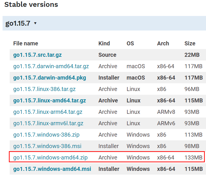 1. https://golang.org/dl/ 是下载go安装包的官网, 国内可能无法访问, 可以访问https://gomirrors.org/ 或者 https://golang.google.cn/dl/, 我这里下载 zip 包进行安装.