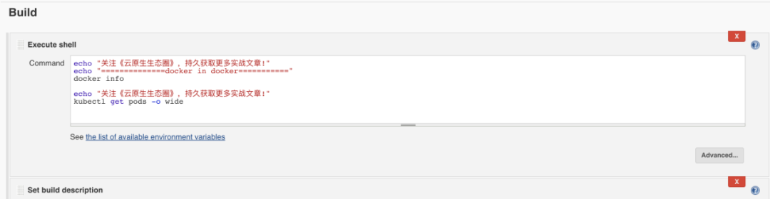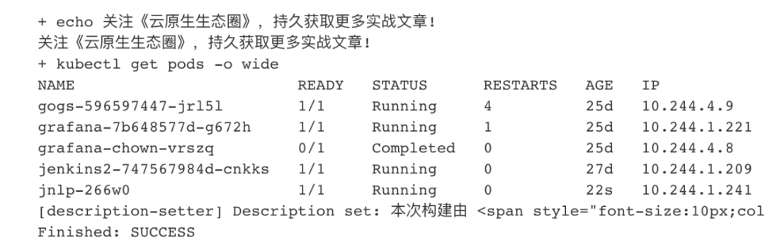 echo "关注《云原生生态圈》,持久获取更多实战文章!"echo "==============docker in docker==========="docker infoecho "关注《云原生生态圈》,持久获取更多实战文章!"kubectl get pods -o wide
