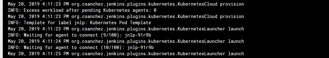 还有一些同学在配置完成后发现启动 Jenkins Slave Pod 的时候,出现 Slave Pod 连接不上,然后尝试100次连接之后销毁 Pod,然后会再创建一个 Slave Pod 继续尝试连接,无限循环,类似于下面的信息: