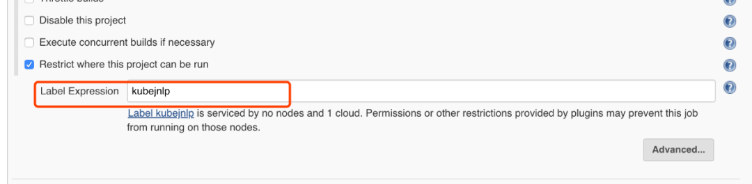 注意在下面的 Label Expression 这里要填入kubejnlp,就是前面我们配置的 Slave Pod 中的 Label,这两个地方必须保持一致