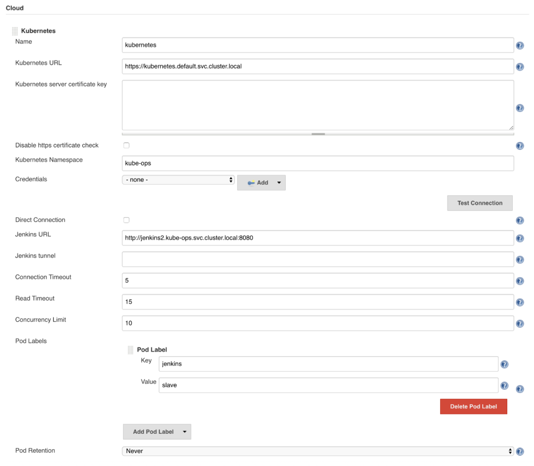 注意 namespace,我们这里填 kube-ops,然后点击Test Connection,如果出现 Connection test successful 的提示信息证明 Jenkins 已经可以和 Kubernetes 系统正常通信了,然后下方的 Jenkins URL 地址:http://jenkins2.kube-ops.svc.cluster.local:8080,这里的格式为:服务名.namespace.svc.cluster.local:8080,根据上面创建的jenkins 的服务名填写,我这里是之前创建的名为jenkins,如果是用上面我们创建的就应该是jenkins2