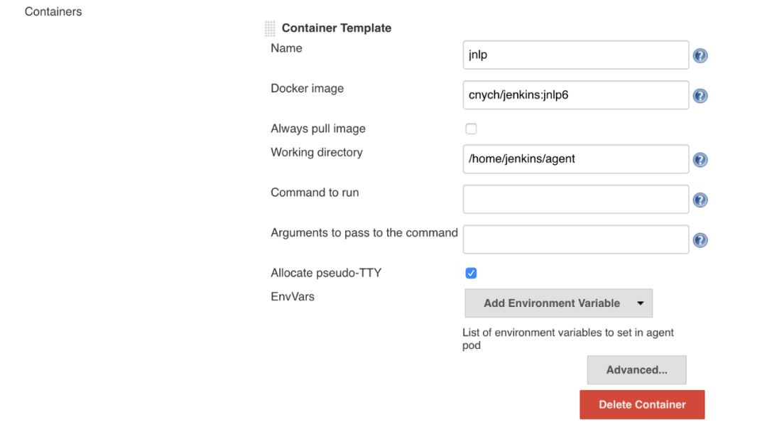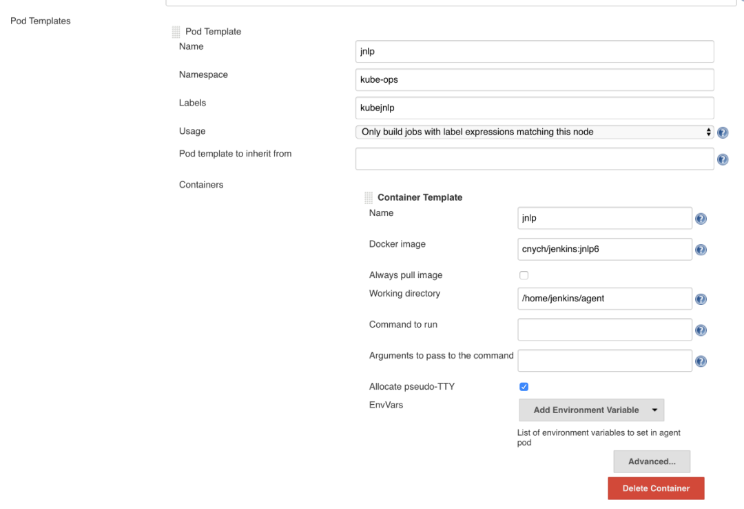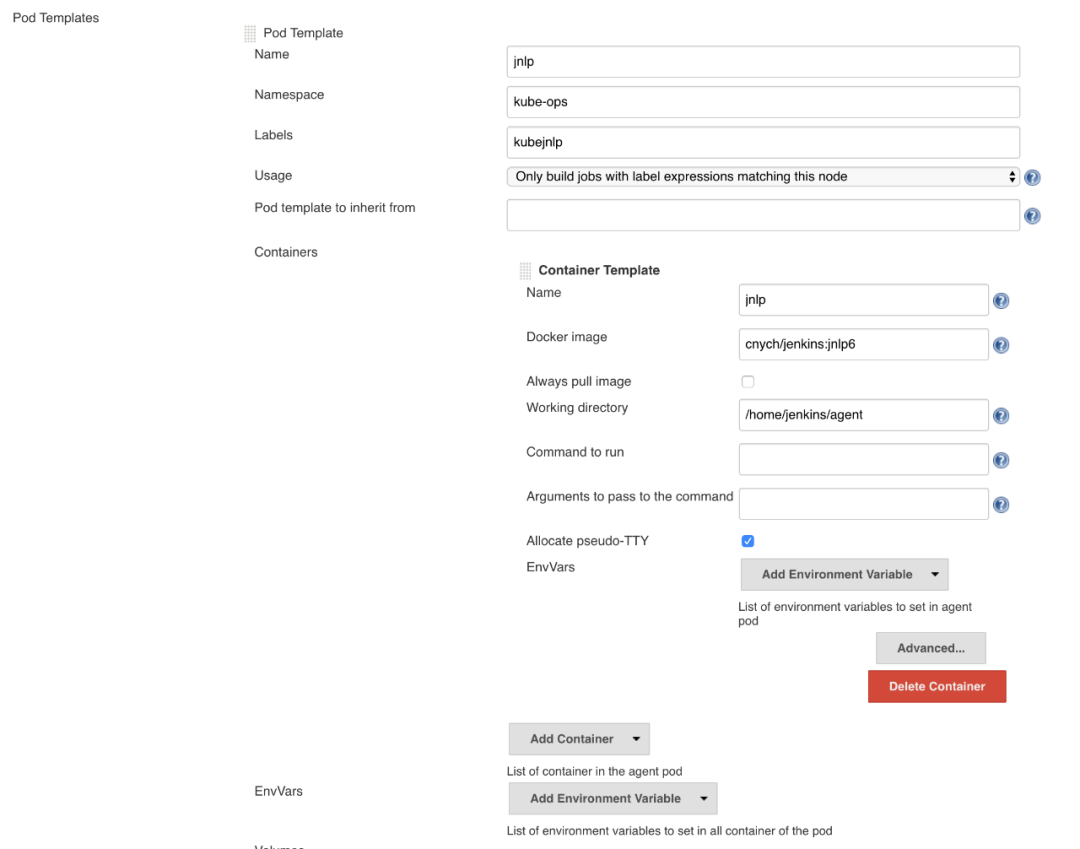 配置 Pod Template,其实就是配置 Jenkins Slave 运行的 Pod 模板,命名空间我们同样是用 kube-ops,Labels 这里也非常重要,对于后面执行 Job 的时候需要用到该值,然后我们这里使用的是 cnych/jenkins:jnlp 这个镜像,这个镜像是在官方的 jnlp 镜像基础上定制的,加入了 kubectl 等一些实用的工具。