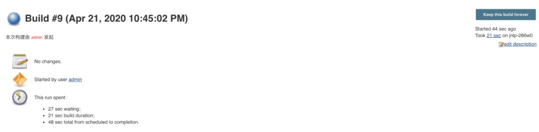 我们可以看到在我们点击立刻构建的时候可以看到一个新的 Pod:jnlp-266w0 被创建了,这就是我们的 Jenkins Slave。任务执行完成后我们可以看到任务信息,比如我们这里是 花费了 21s 时间在 这个 Slave上面