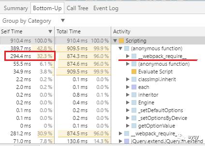 rollup没有生成这些额外的东西,执行耗时主要在于Compile Script和Evaluate Script上,其余部分可以忽略不计,如下图: