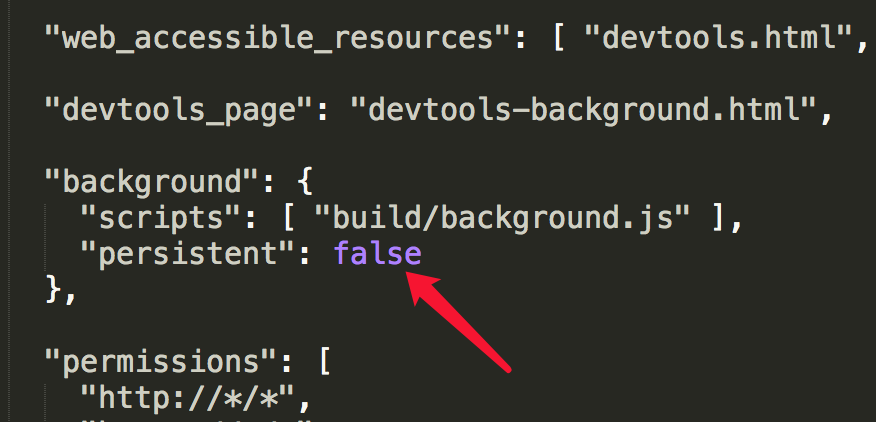 3修改manifest.json ( 打开shells>chrome>src>manifest.json并把json文件里的"persistent":false改成true )